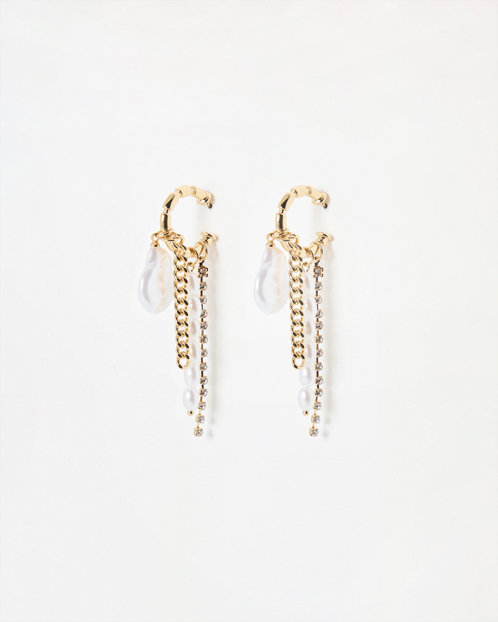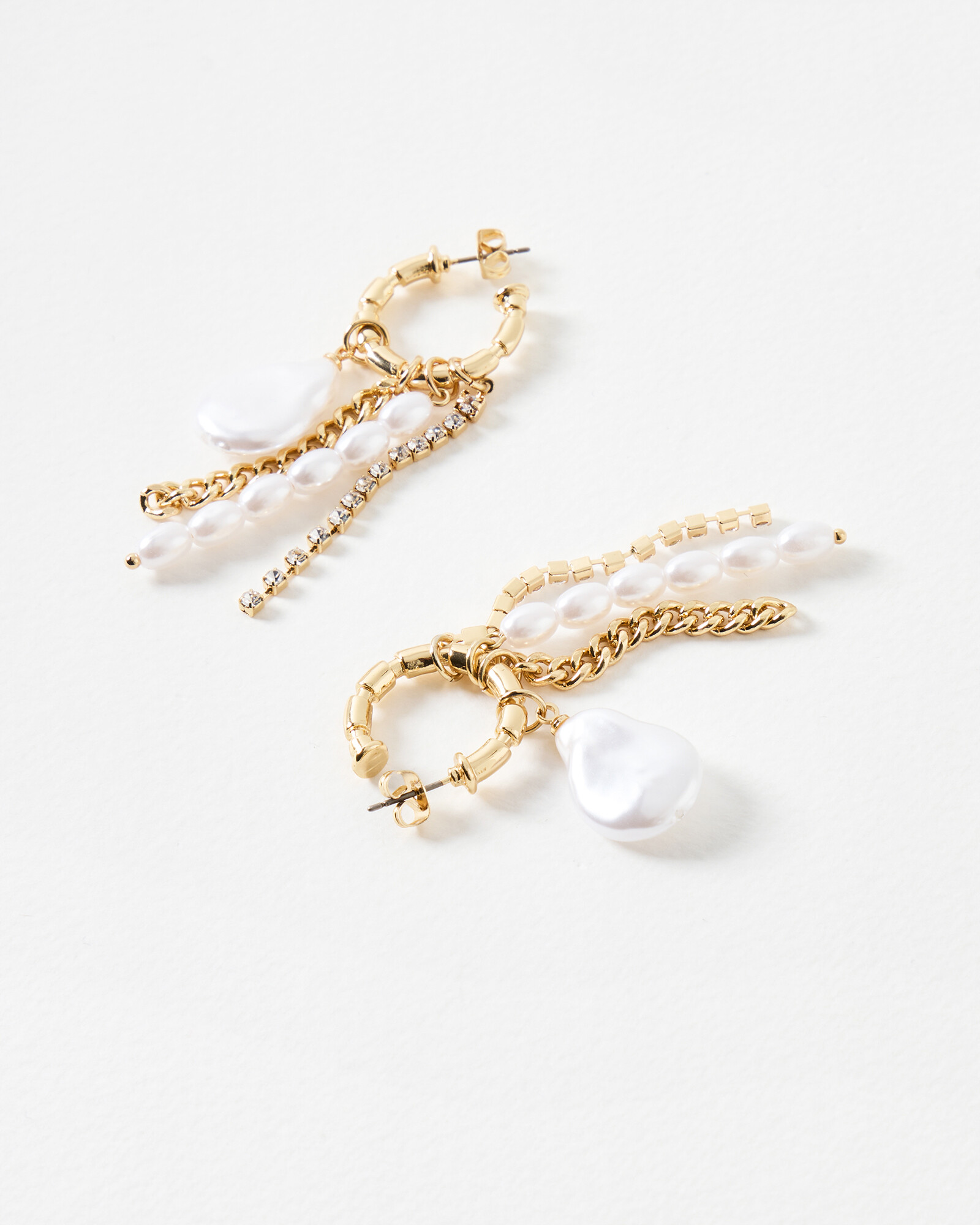 Gold-toned hoop earrings with butterfly backs and a textured surface. Features a multi-strand drop with a large faux-pearl charm, clear gems and textural chain details.