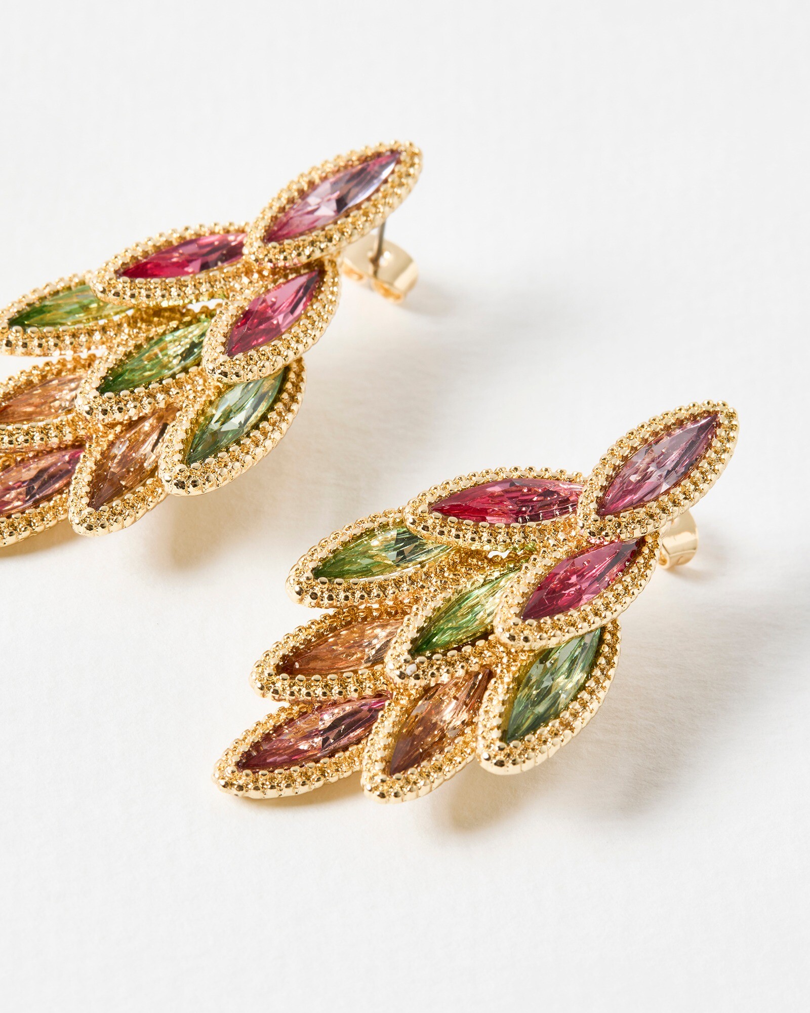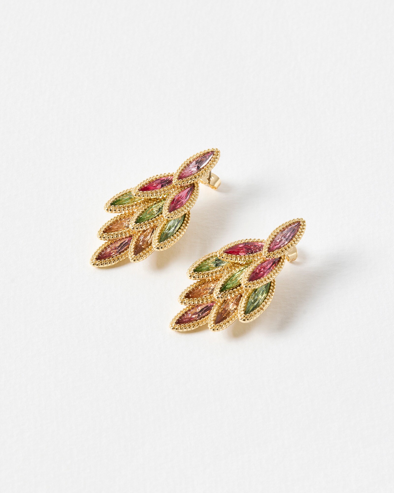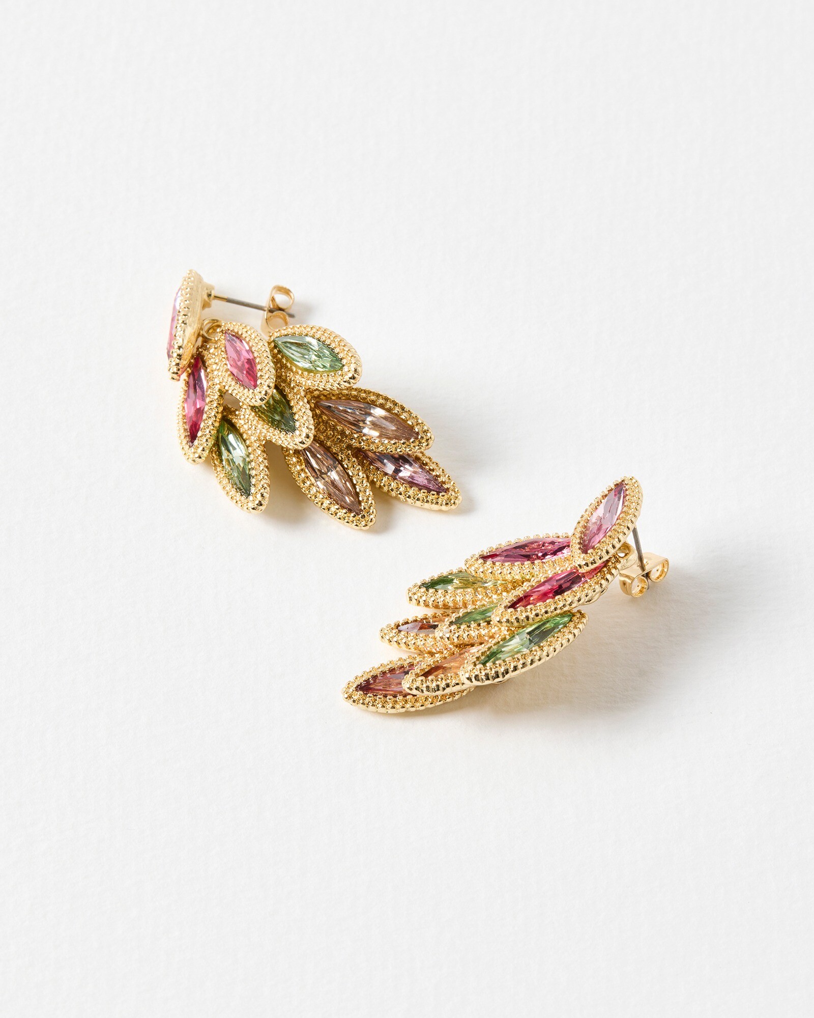 Large statement earrings in a gold tone metal embellished with multicoloured oval gemstones in pink, green and orange hues. Secured to a stud base for easy wear, these dangle earrings hang beneath the lobe in a layered fashion creating a feathered look. Style with the matching necklace to complete the set, and wear on holidays or with your festival outfits for a colourful finish.