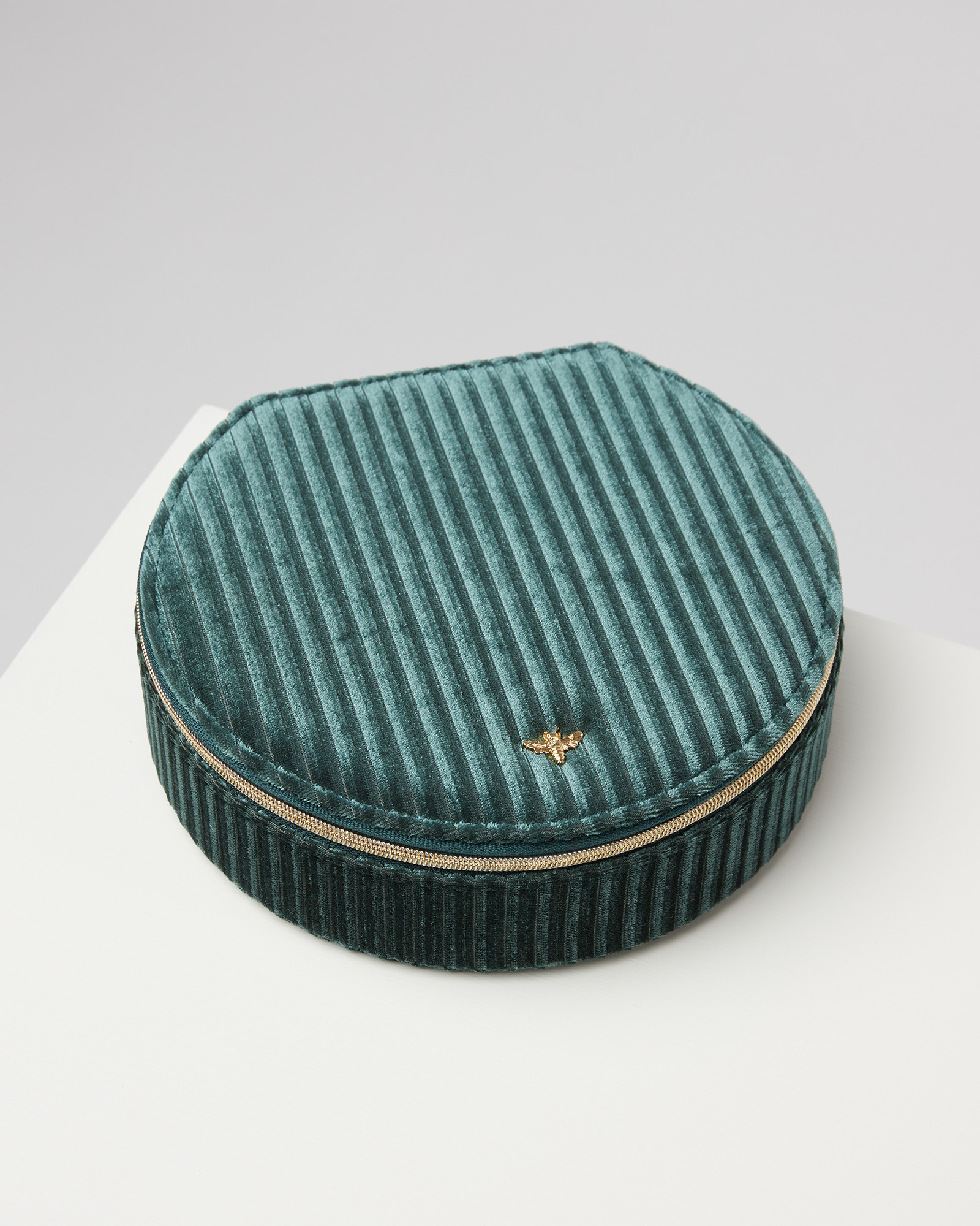 In teal blue pleated velvet, this circular travel jewellery box will add a touch of luxe to your travels. With a dainty gold-toned bee and zip fastening, this circular jewellery box unzips to reveal three compartments with a dedicated space to slot in earrings and rings, and a small slip pocket, completed with a two-tone sunrise lining and a tortoiseshell zip pull.