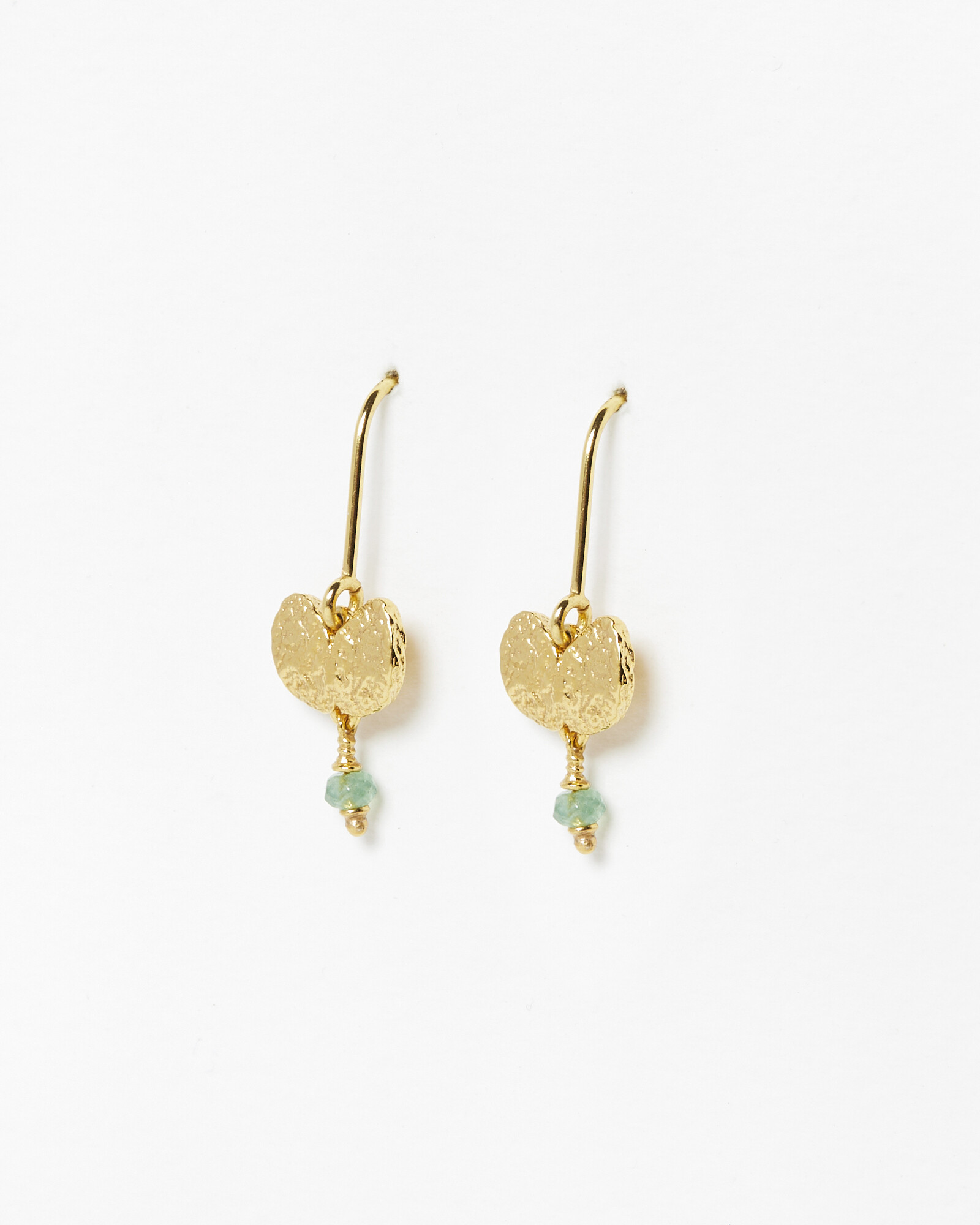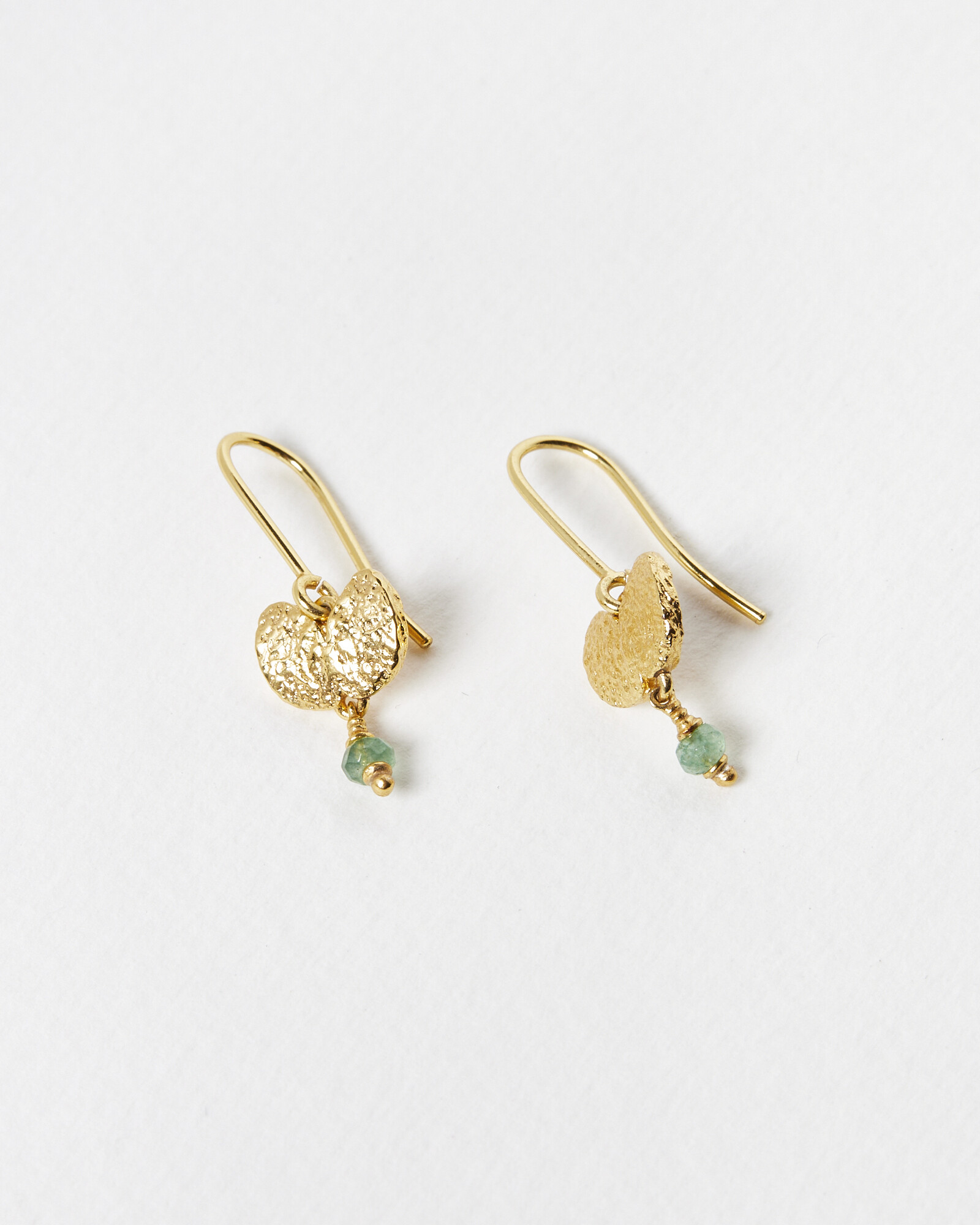 Our gold jewellery is coated in approximately one micron of 10-carat gold plate on a brass base. We use gold plating to keep our pieces both high quality and affordable, for long-term wear. For more information about the materials we use in our jewellery, read our jewellery material guide.