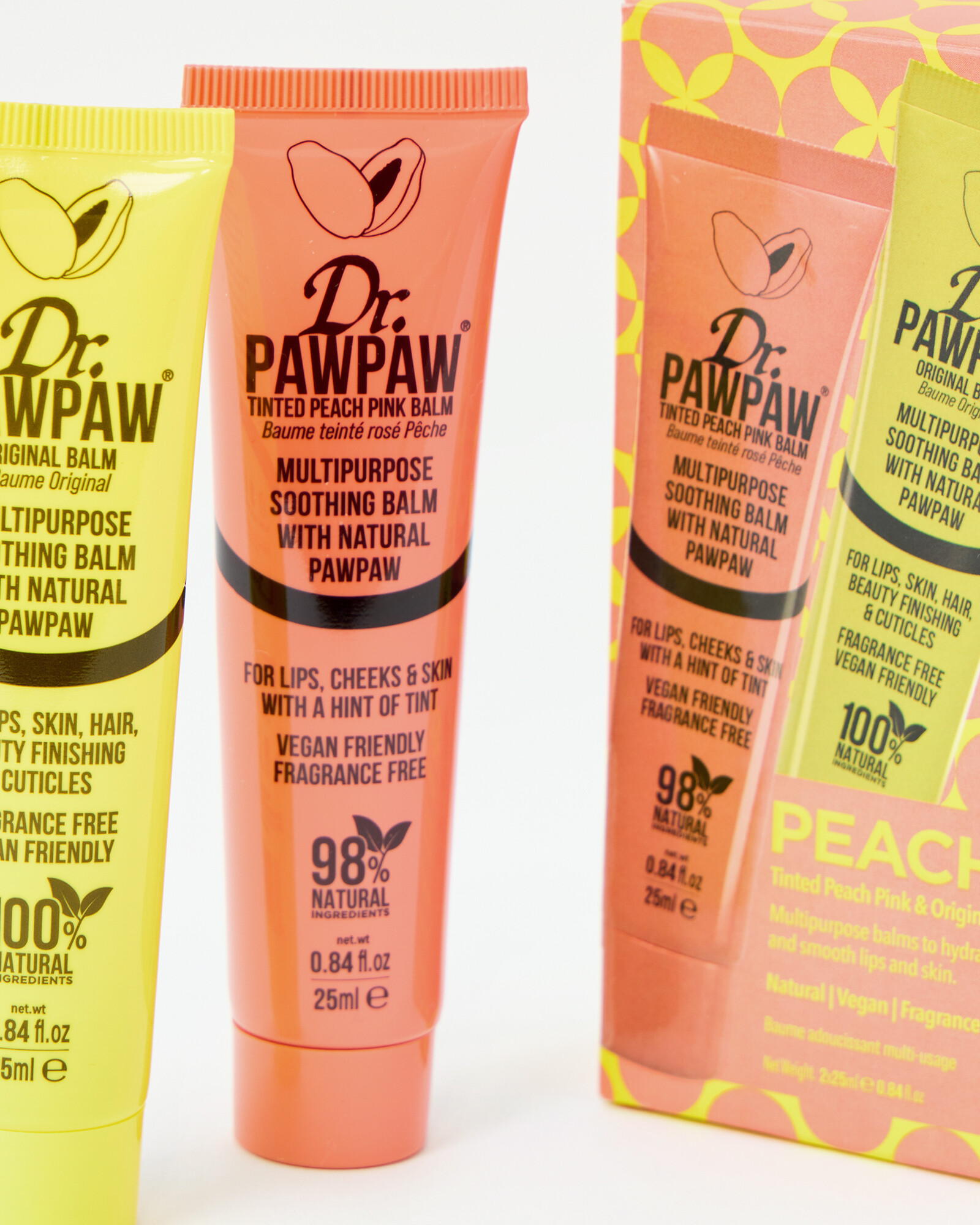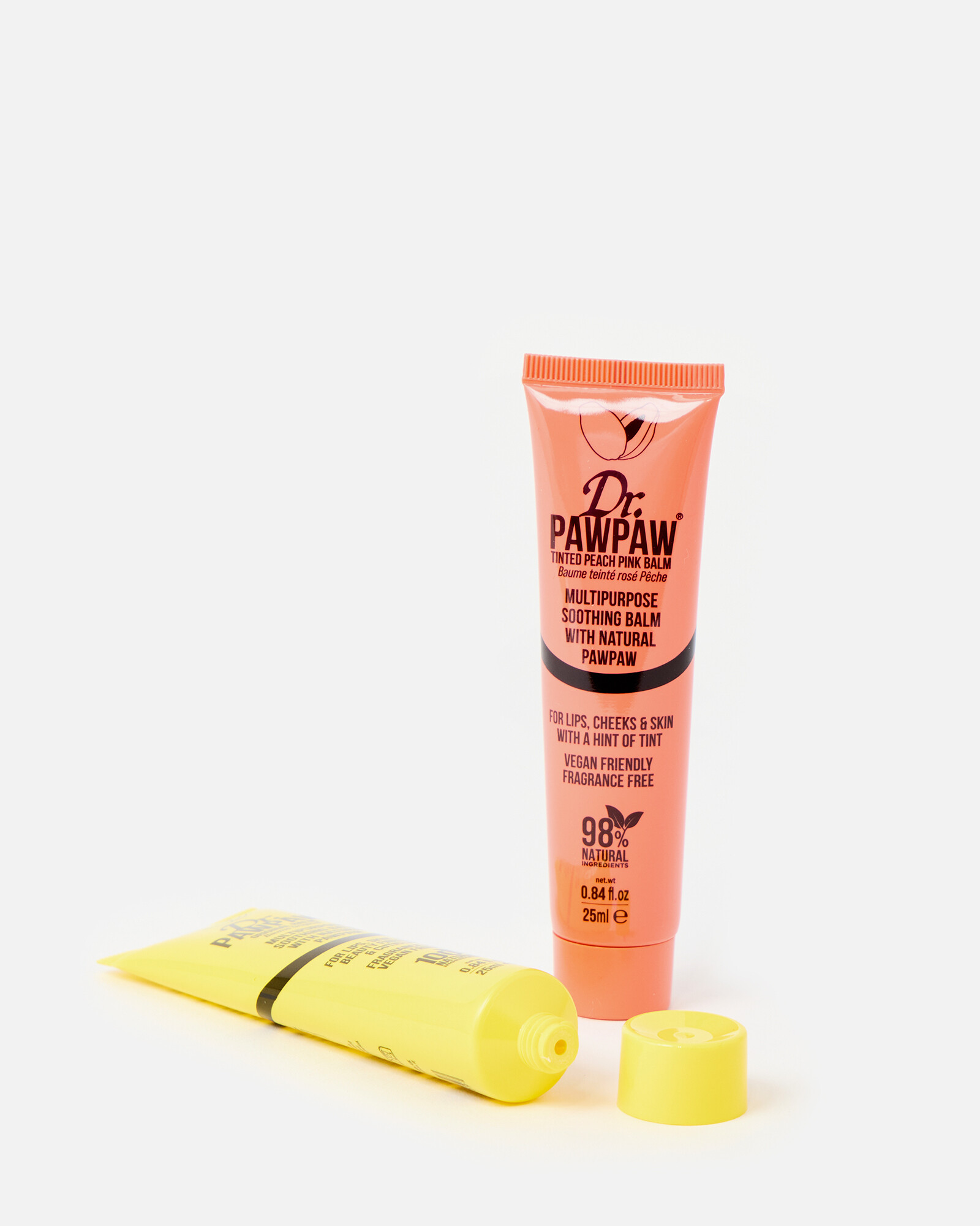 Peachy pink duo from Dr Paw Paw, featuring their original soothing multipurpose balm and their tinted peach pink balm for lips, cheeks and skin with a hint of tint. Both balms are natural, vegan and fragrance free.