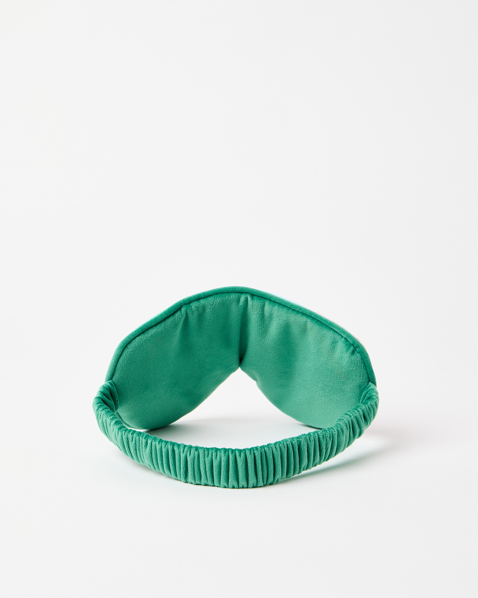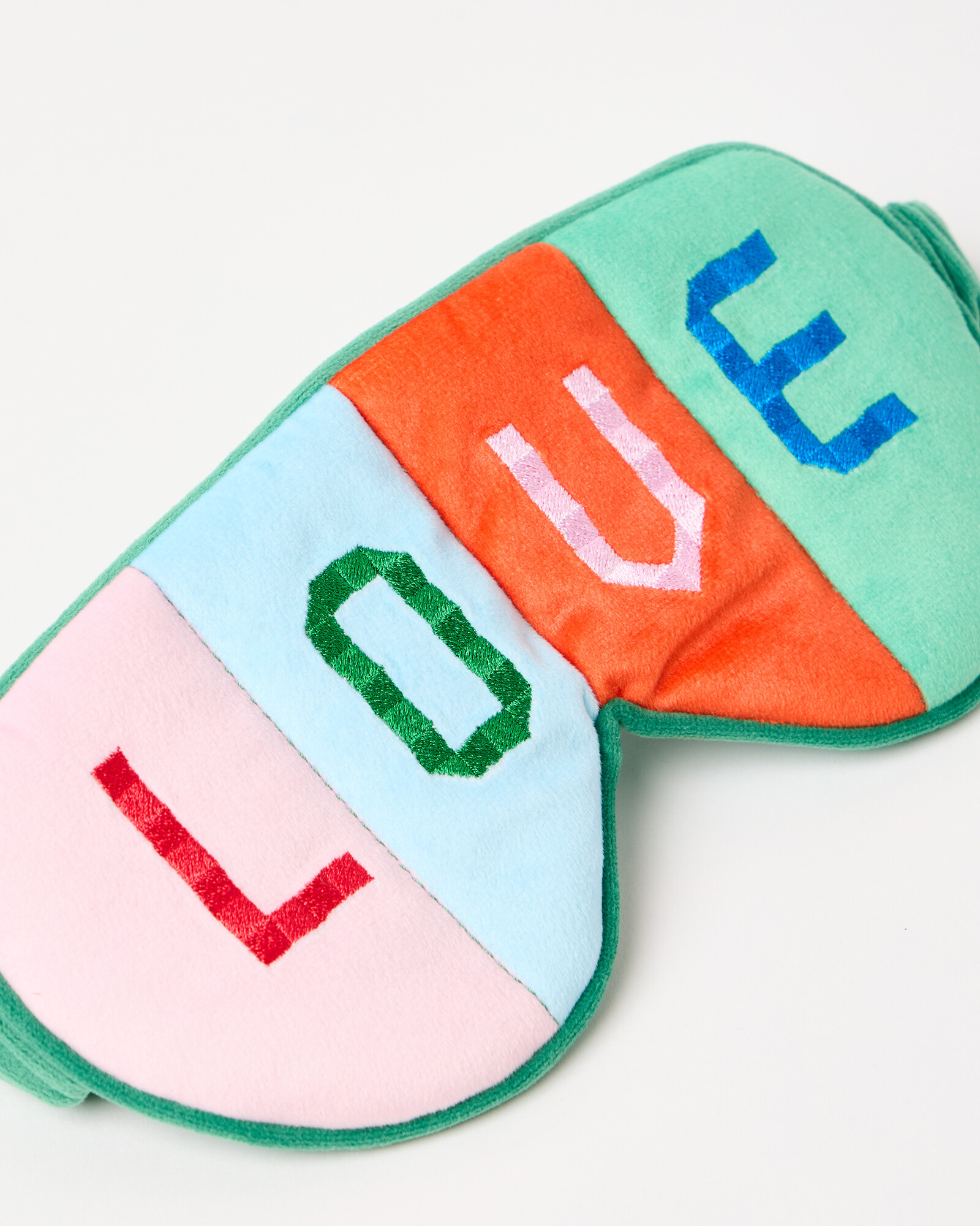 Velvet eye mask with patchwork panels in vibrant colour combinations and embroidered letters.