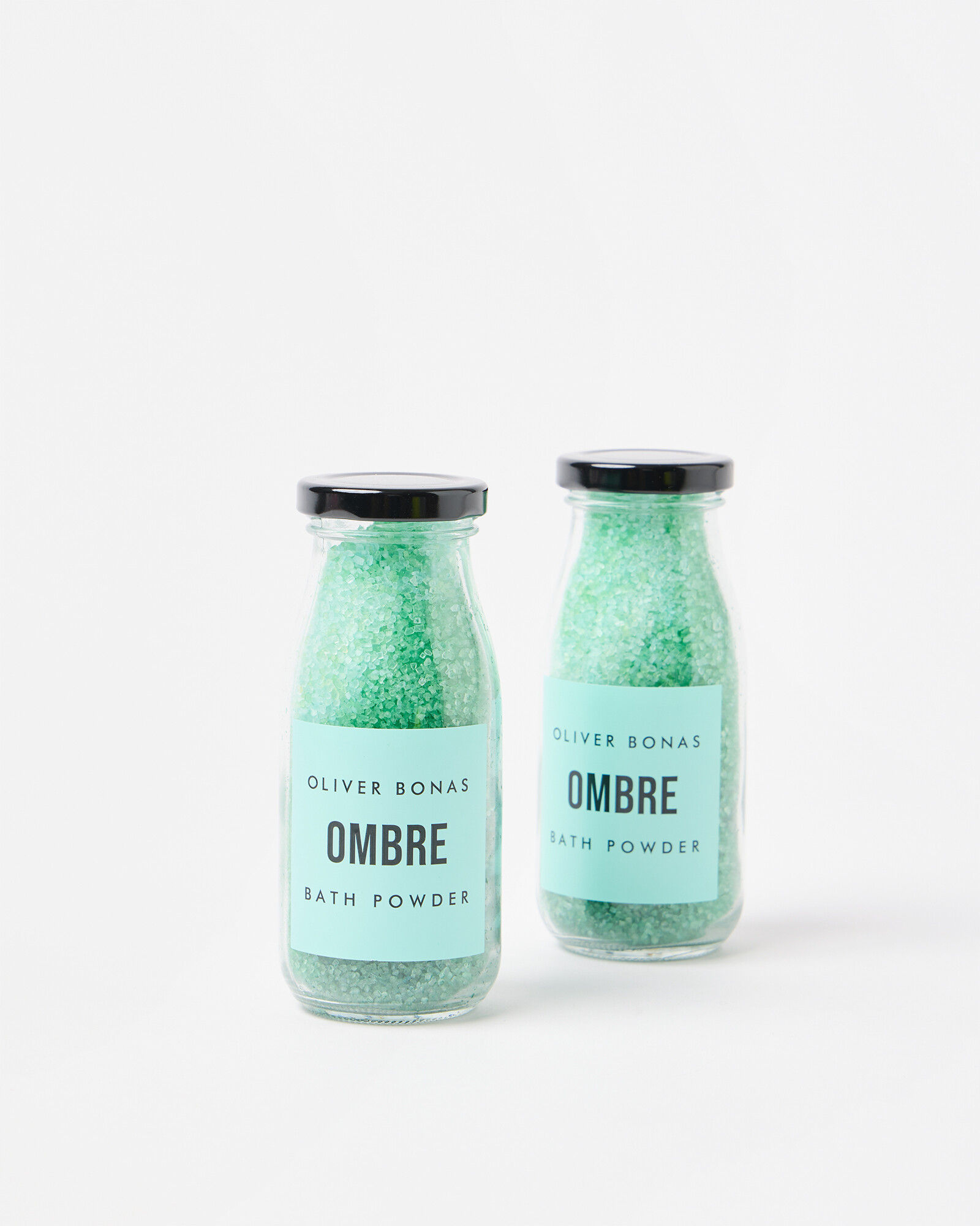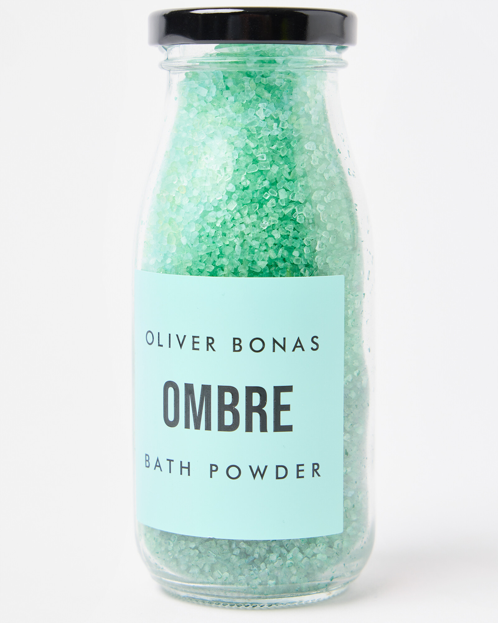 Mandarin & basil scented bath powder with green ombre pieces.