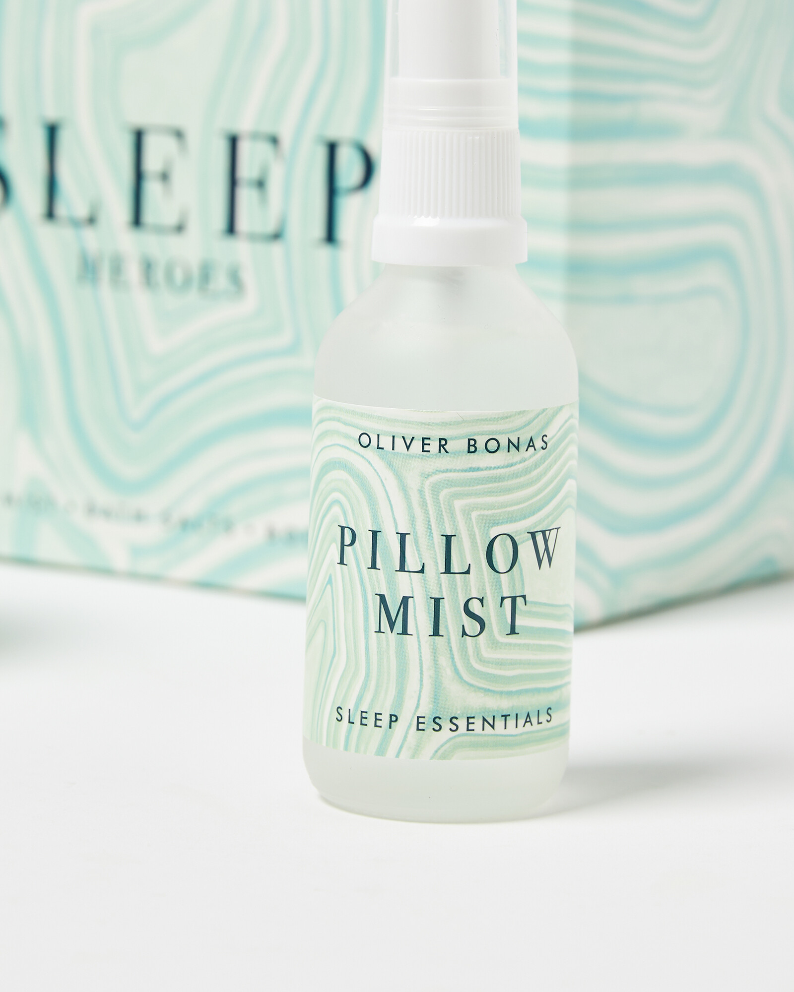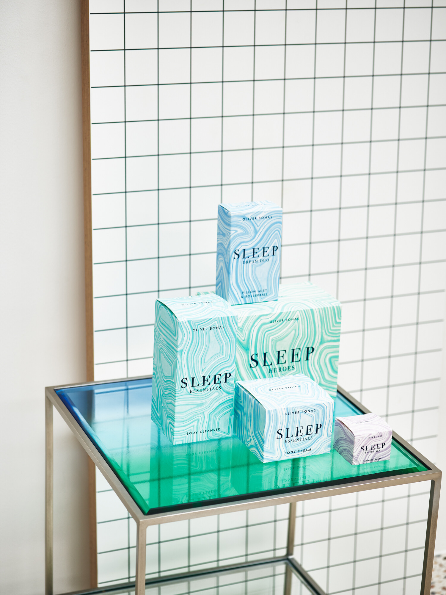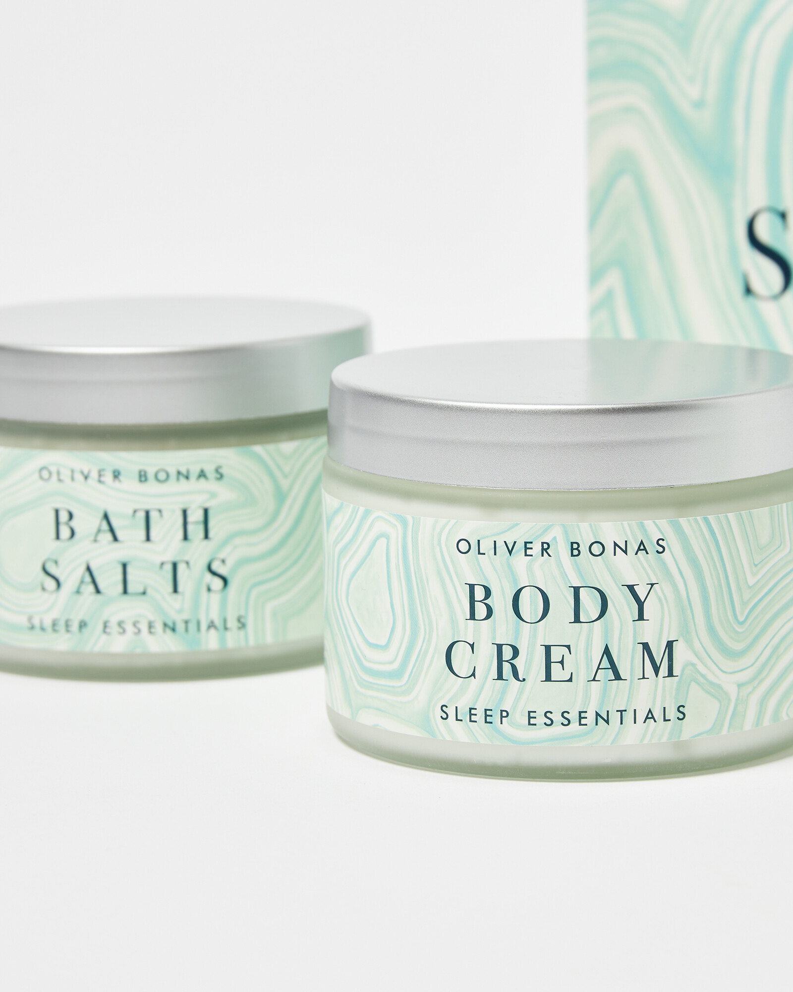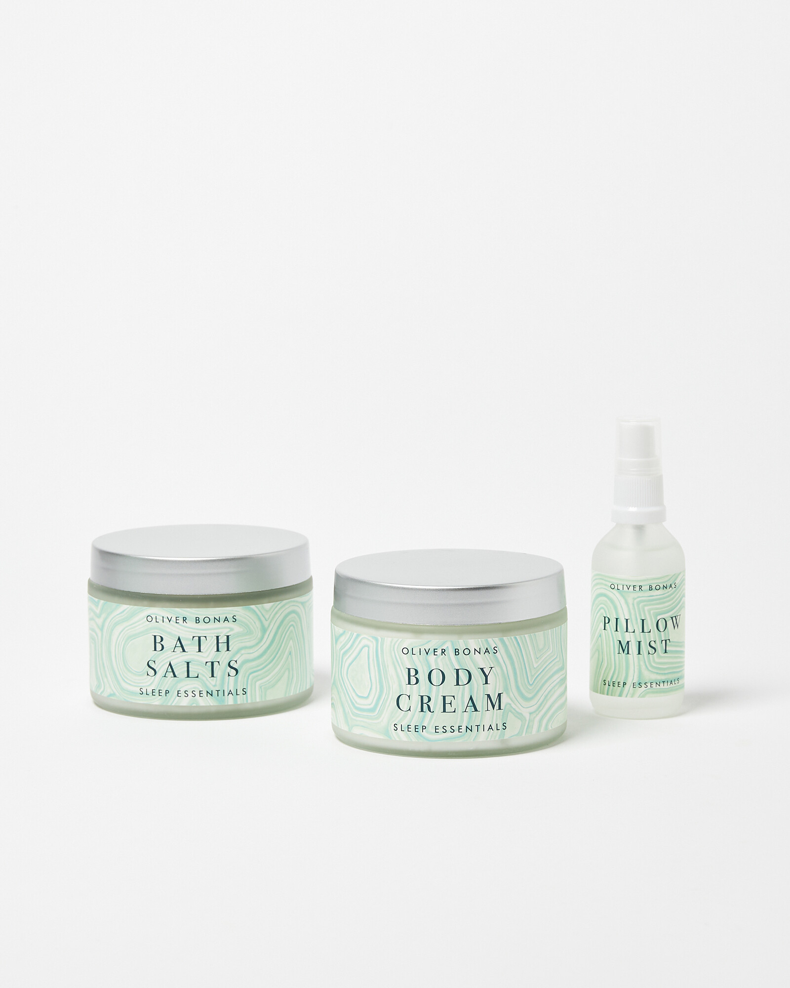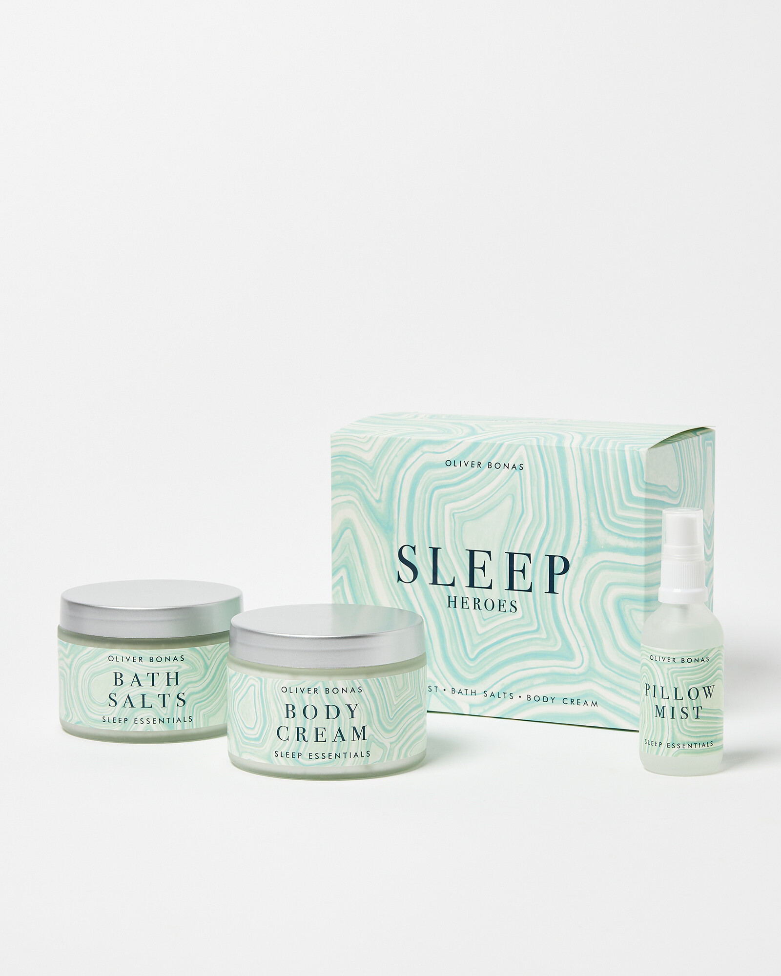 Relaxing beauty set with three scented products to encourage a restful sleep, including bath salts, magnesium body cream and a pillow mist. Drawn and designed in the OB studios, the agate-inspired packaging is in calming shades of green.
