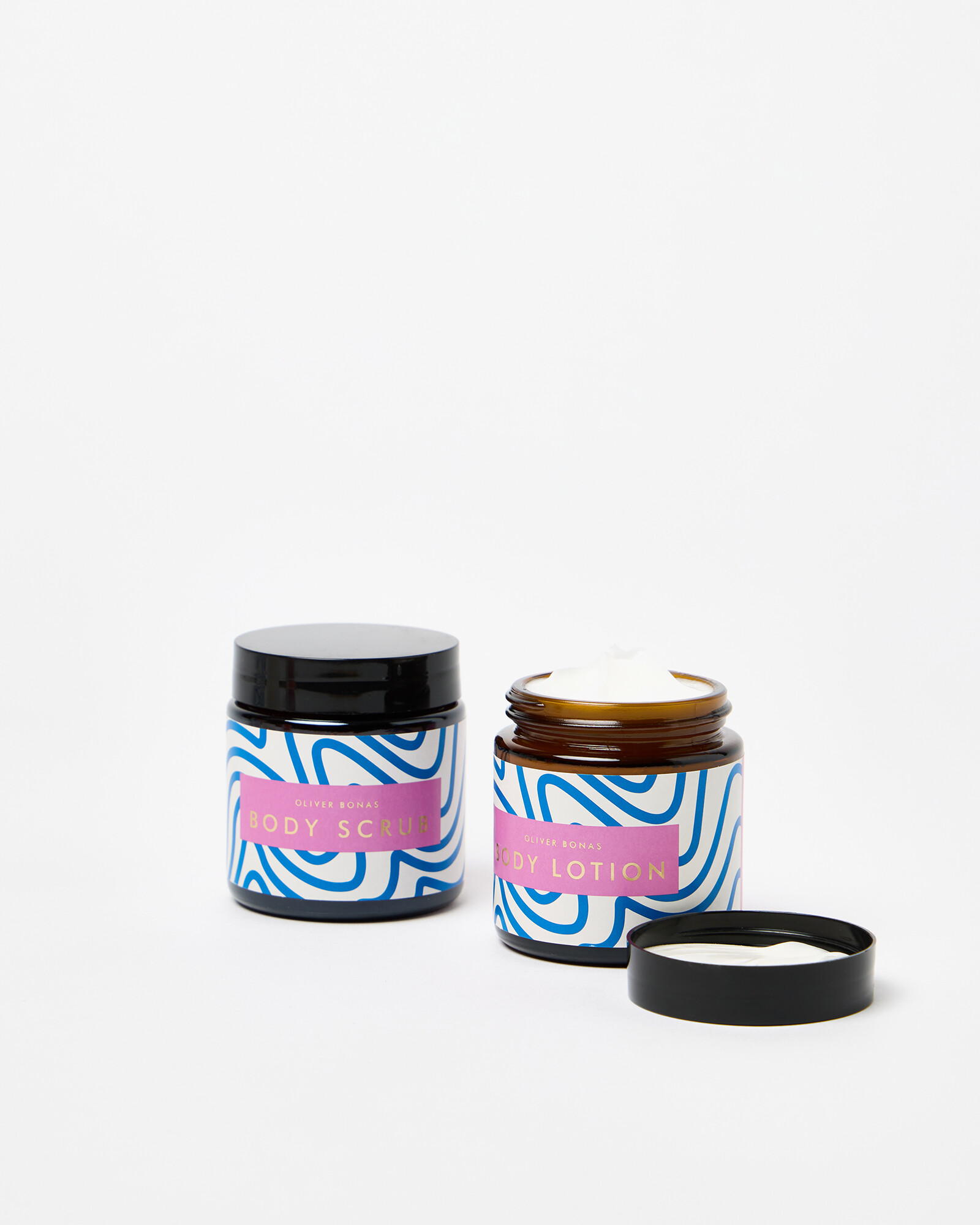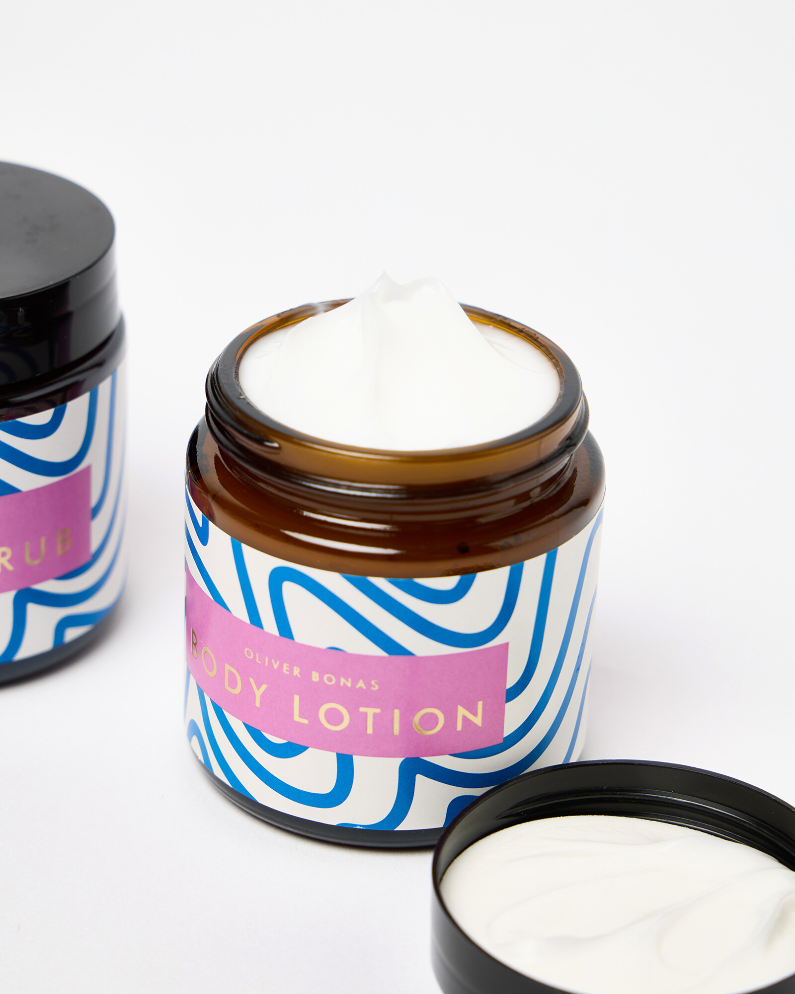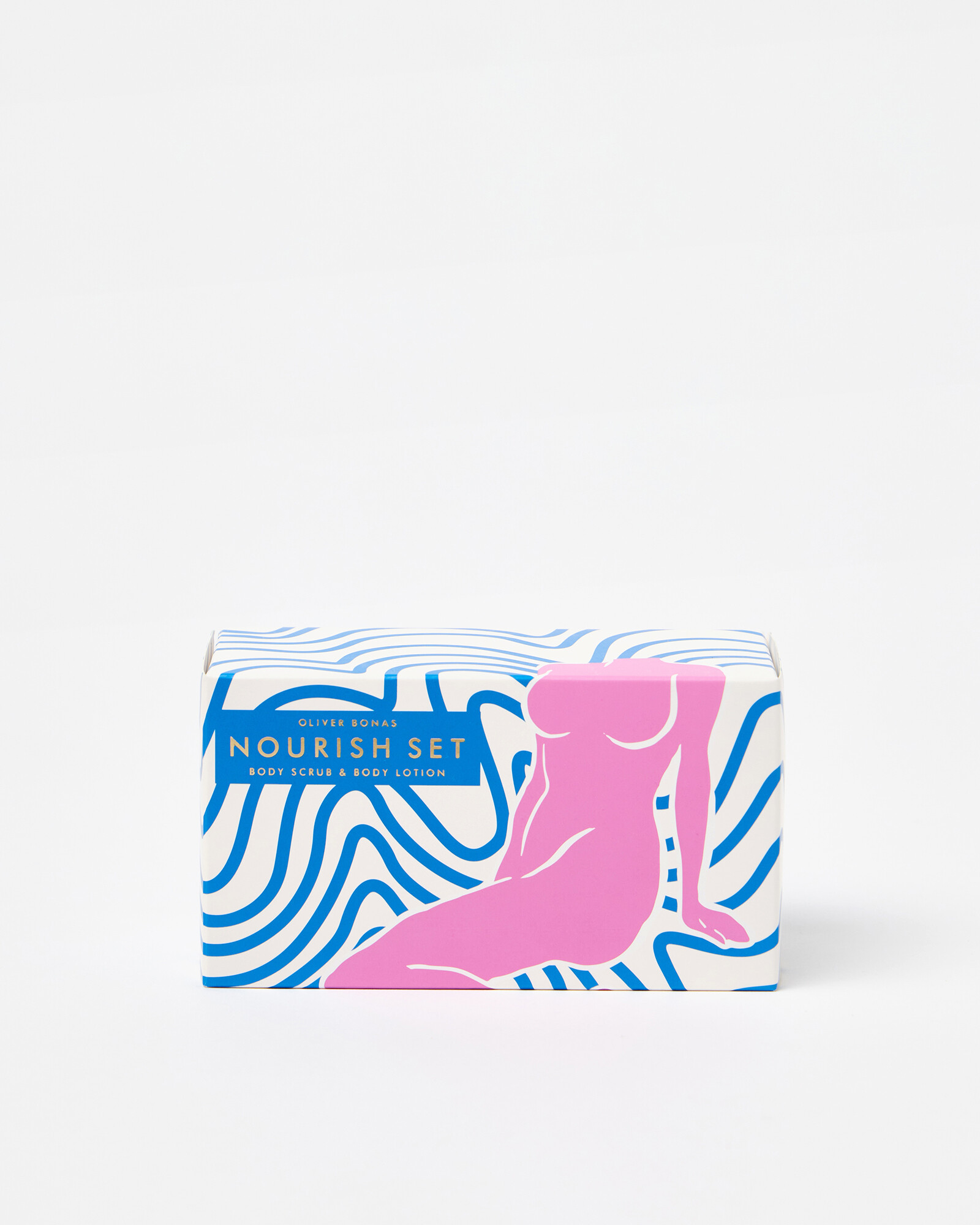 Body scrub and body lotion set scented with tuberose and sandalwood. Packaged in a gift box illustrated with a hand-drawn figure and bold graphic pattern designed in the OB creative studios.