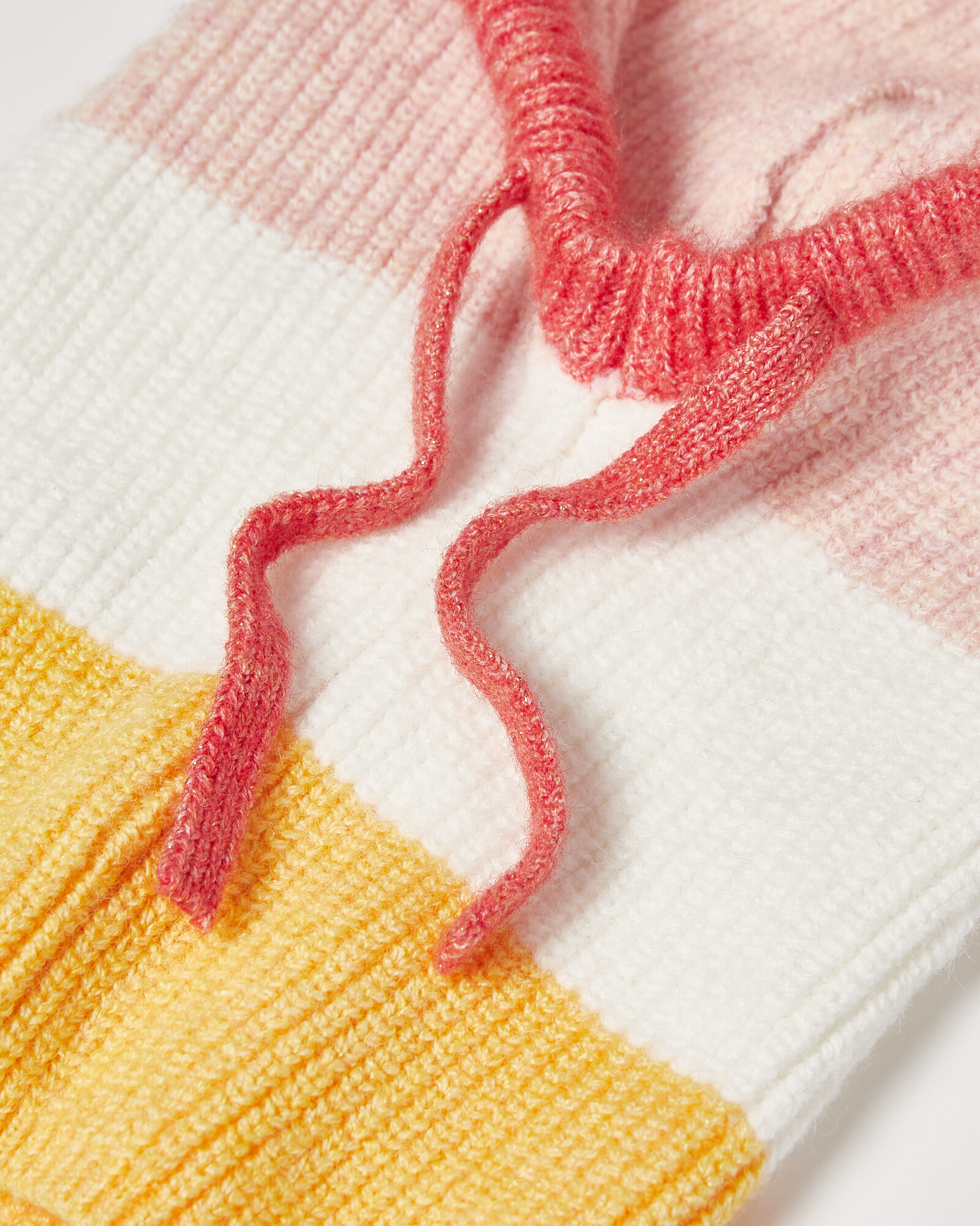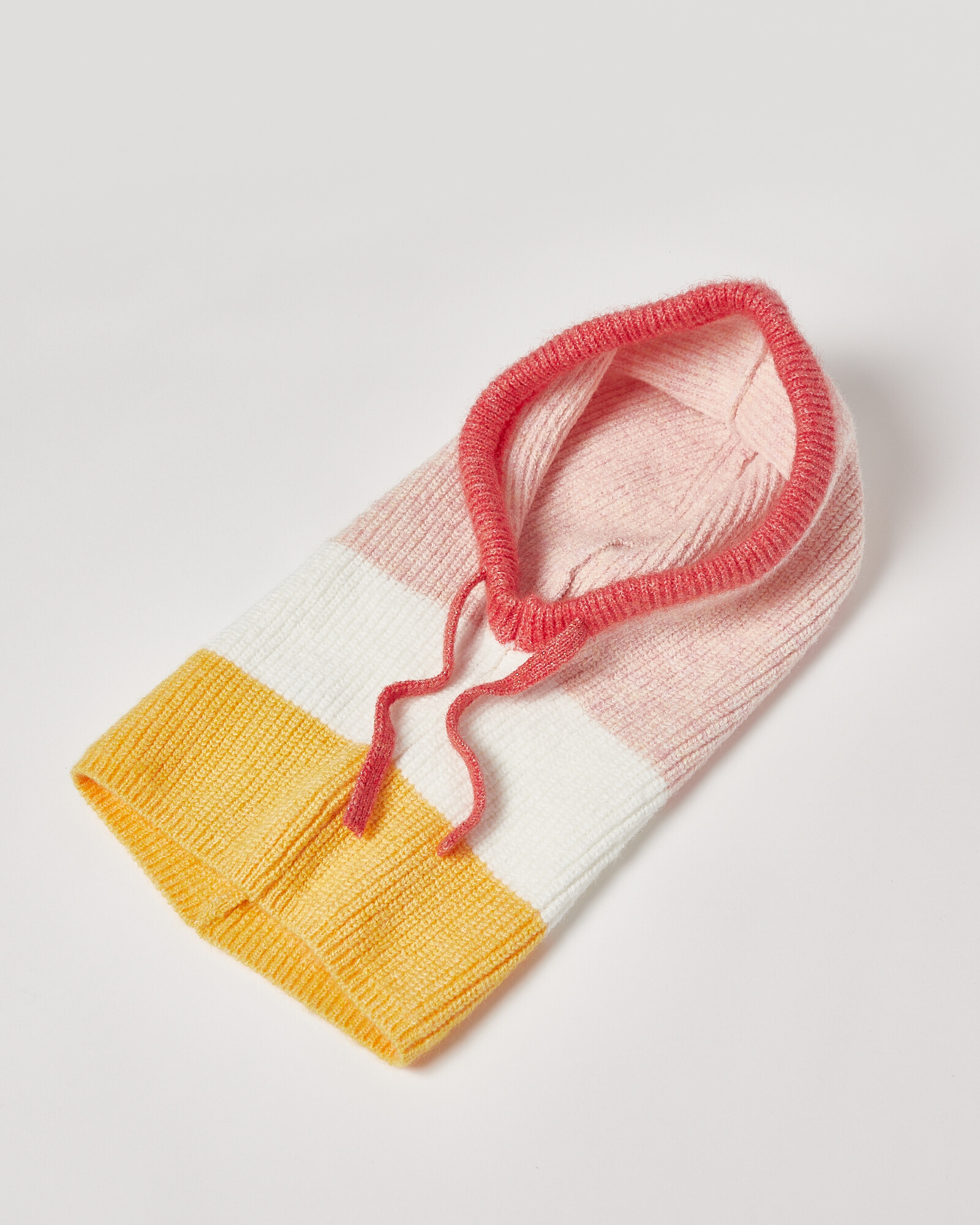 An alternative to your winter beanie, this knitted hood is in a striped colour block pattern with drawstring ties to provide an extra layer of warmth under your coat, jumper or sweatshirt.
