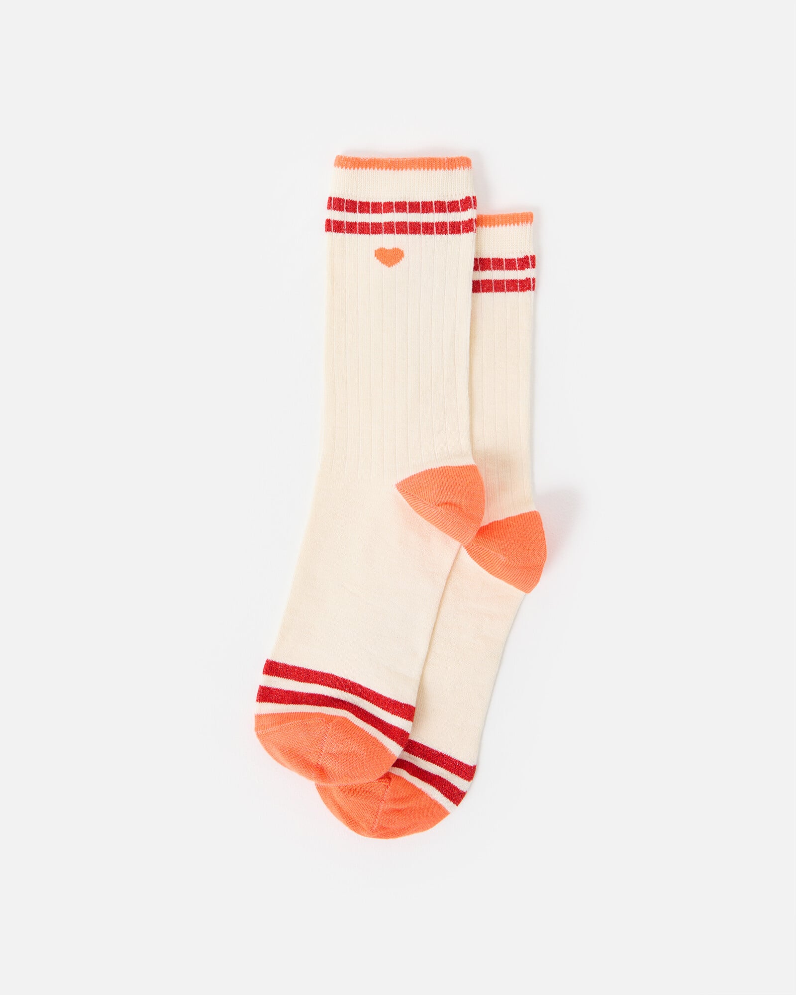 Cream sporty ankle socks knitted in a ribbed pattern with metallic red stripes on the trims and an orange heart.