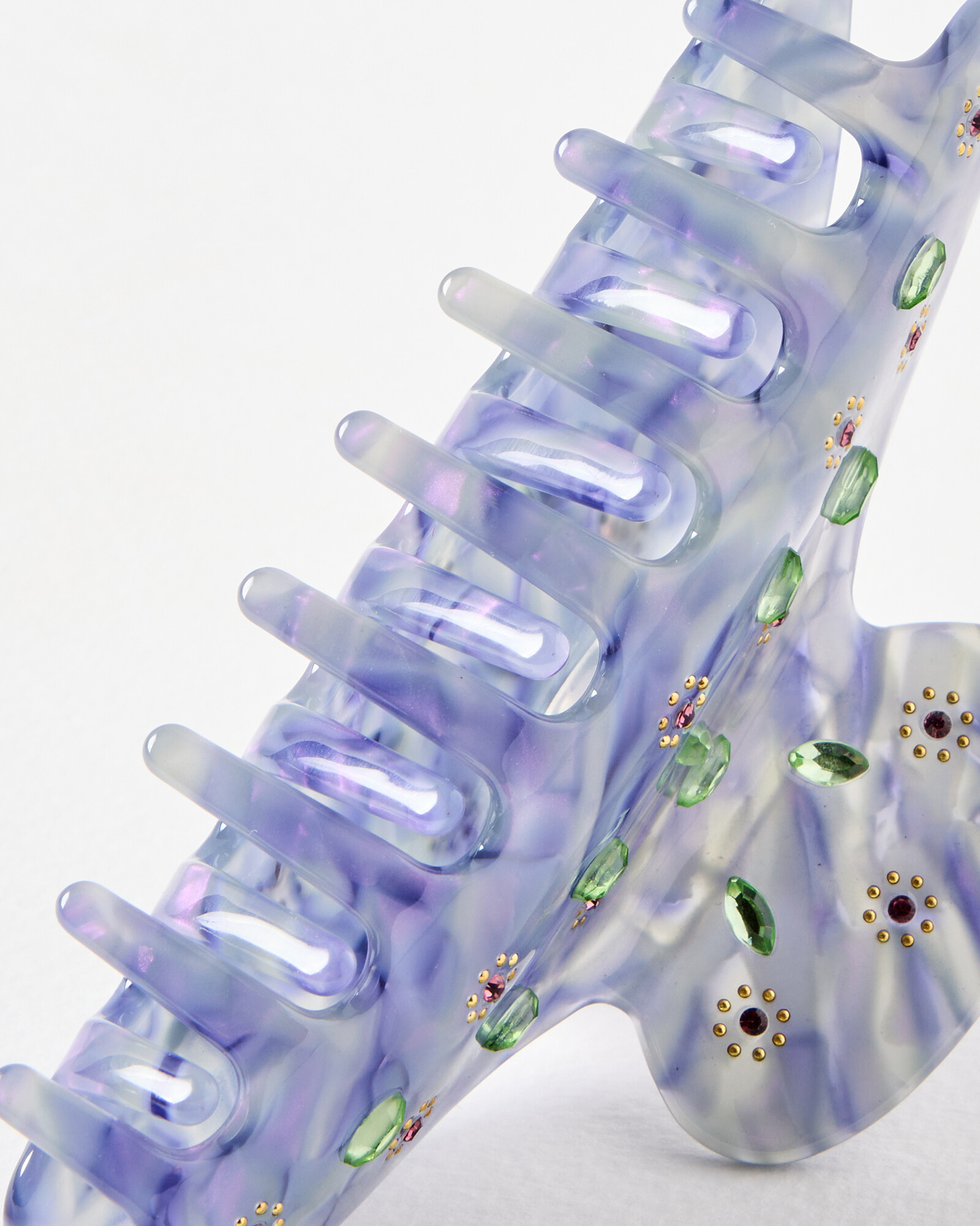 Purple claw clip embellished with green stones and floral gems.