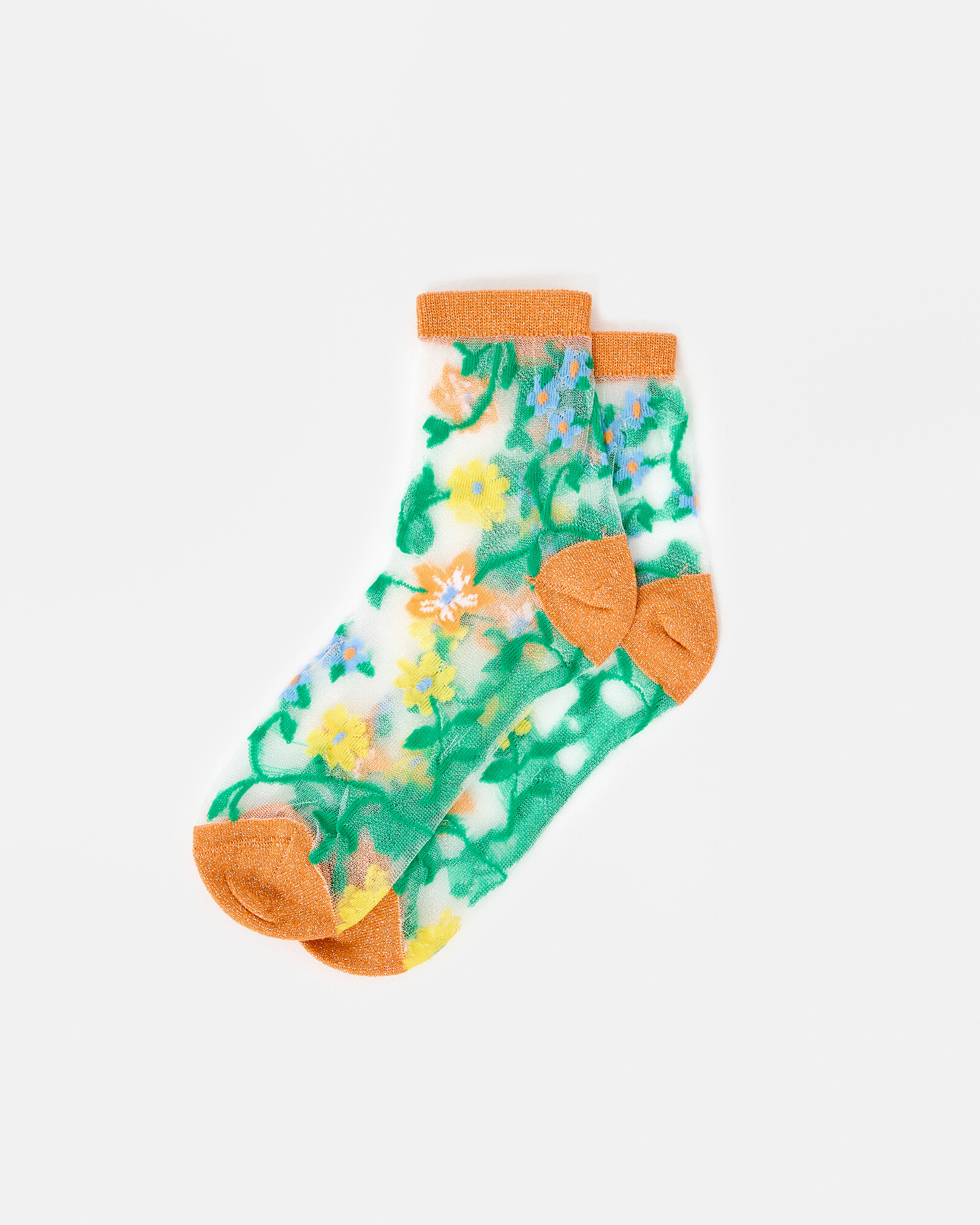 Sheer ankle socks knitted in a blue, green and yellow floral pattern with orange sparkly trims.