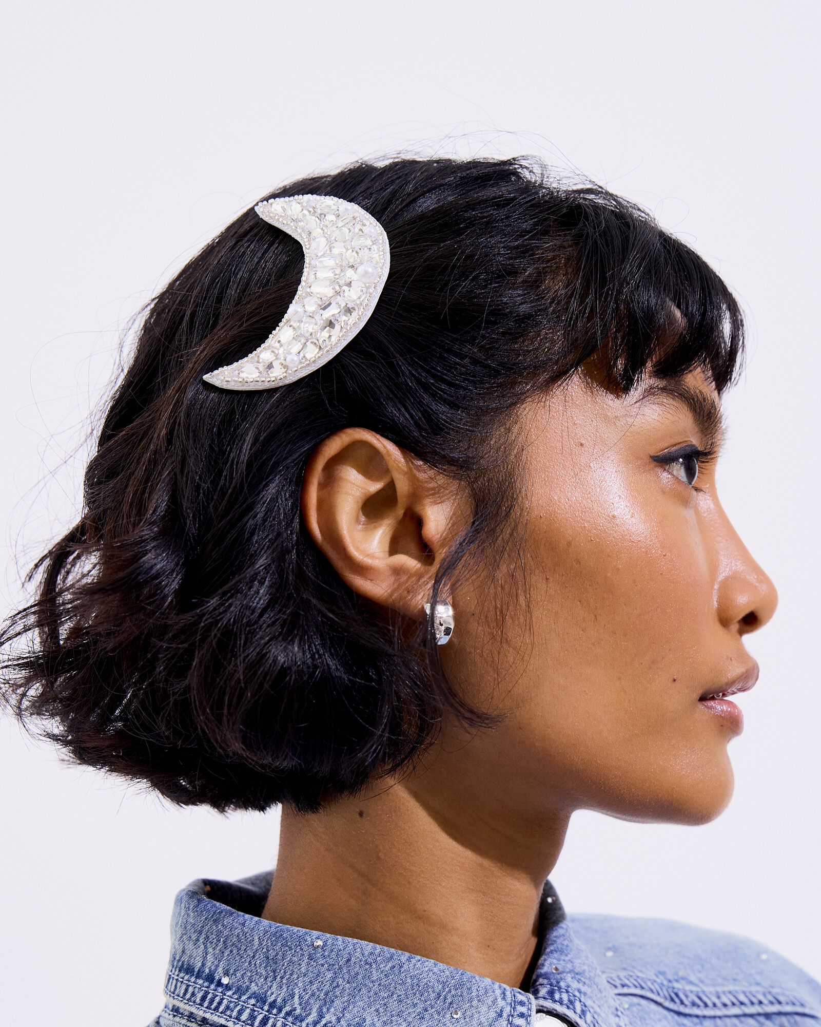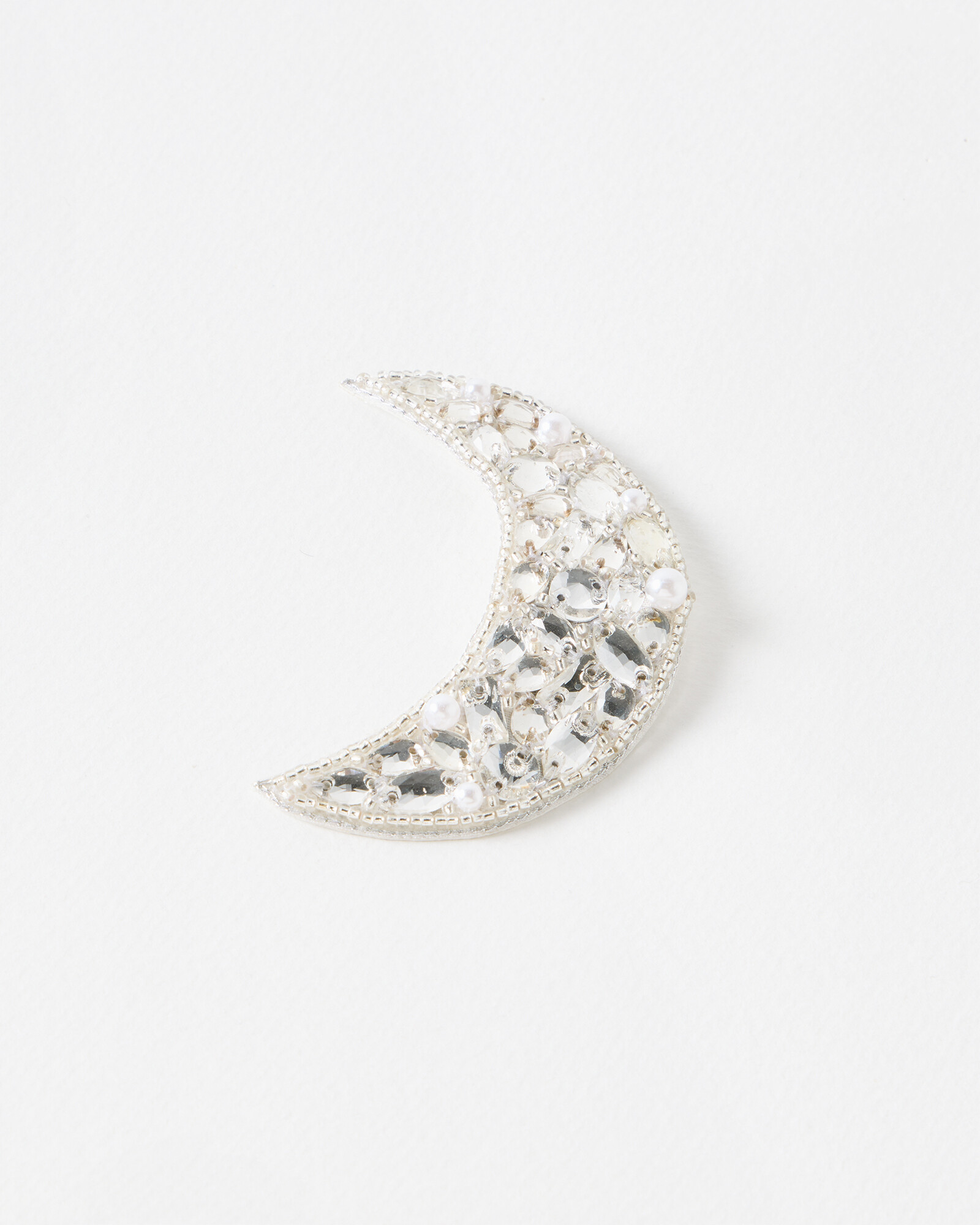 Silver hair clip in a moon shape embellished with clear gems, beads and faux pearls.