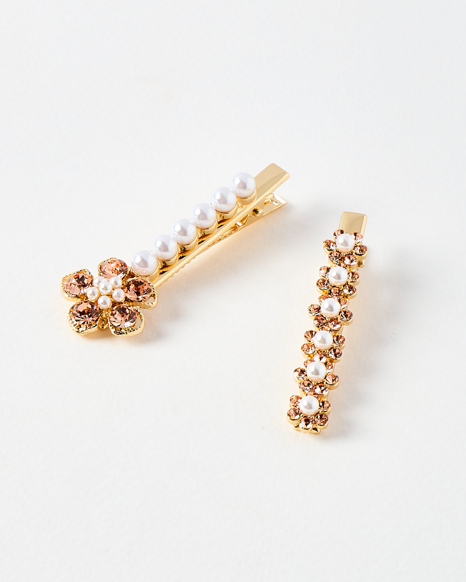 Set of two slim hair clips with a pink gem flower, faux pearls and golden hardware.