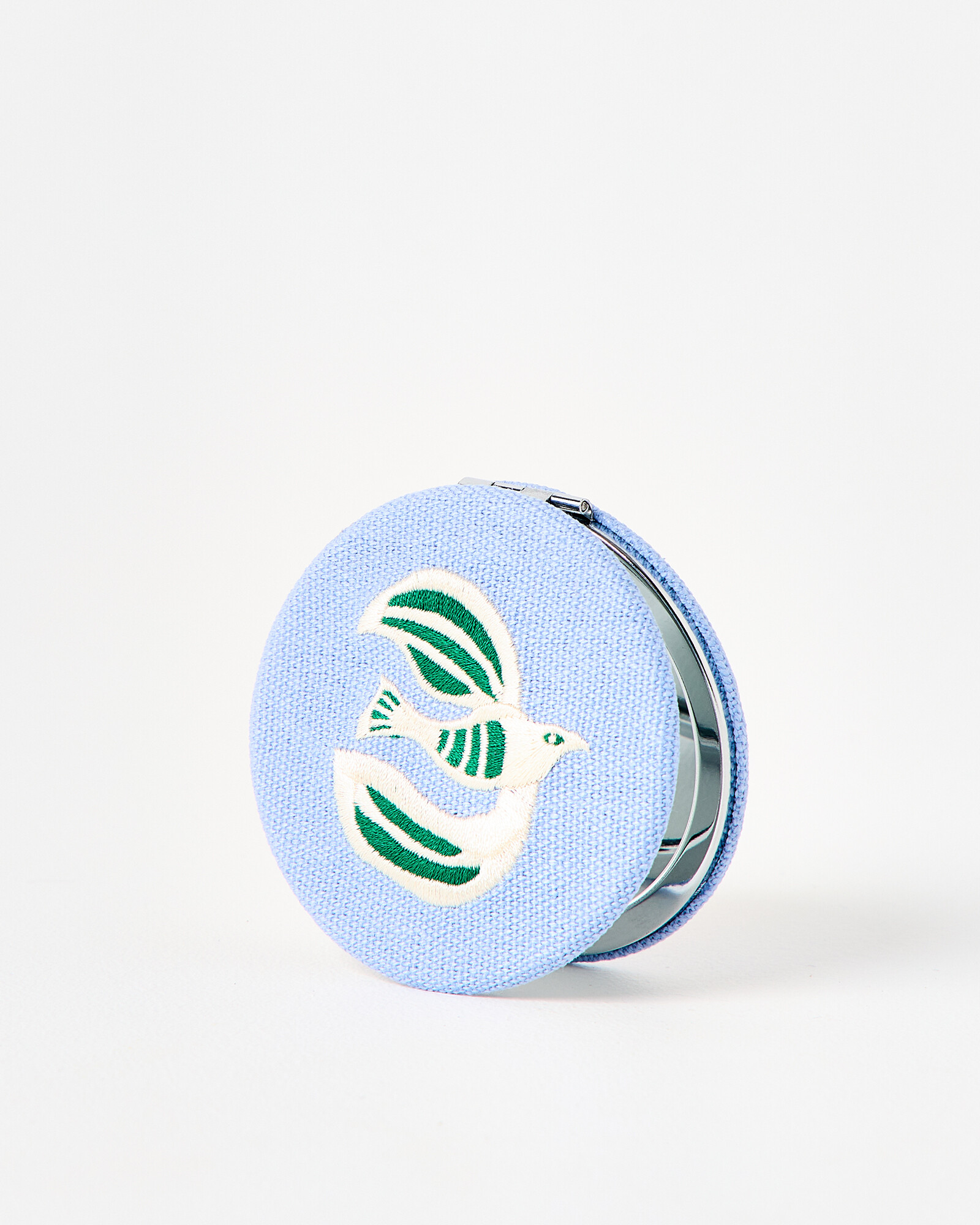 Small round compact mirror in a powder blue fabric with an embroidered white bird motif, designed in the OB creative studios. The perfect size for slipping into your handbag or makeup pouch, to keep on hand throughout the day.