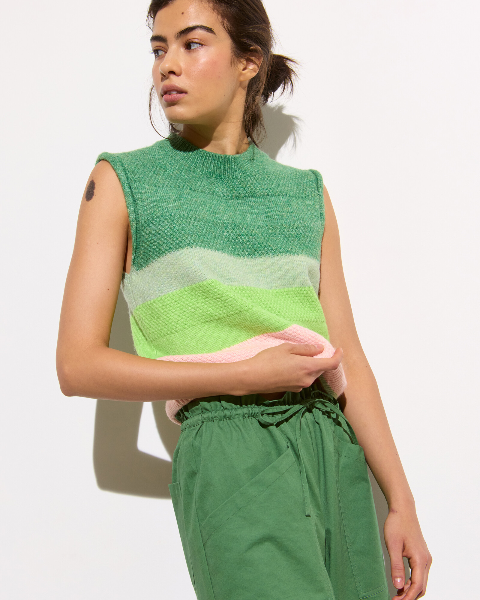 Green Tie Waist Cropped Wide Leg Trousers