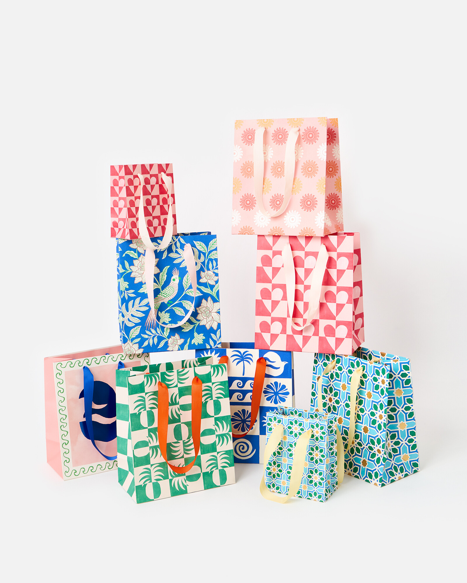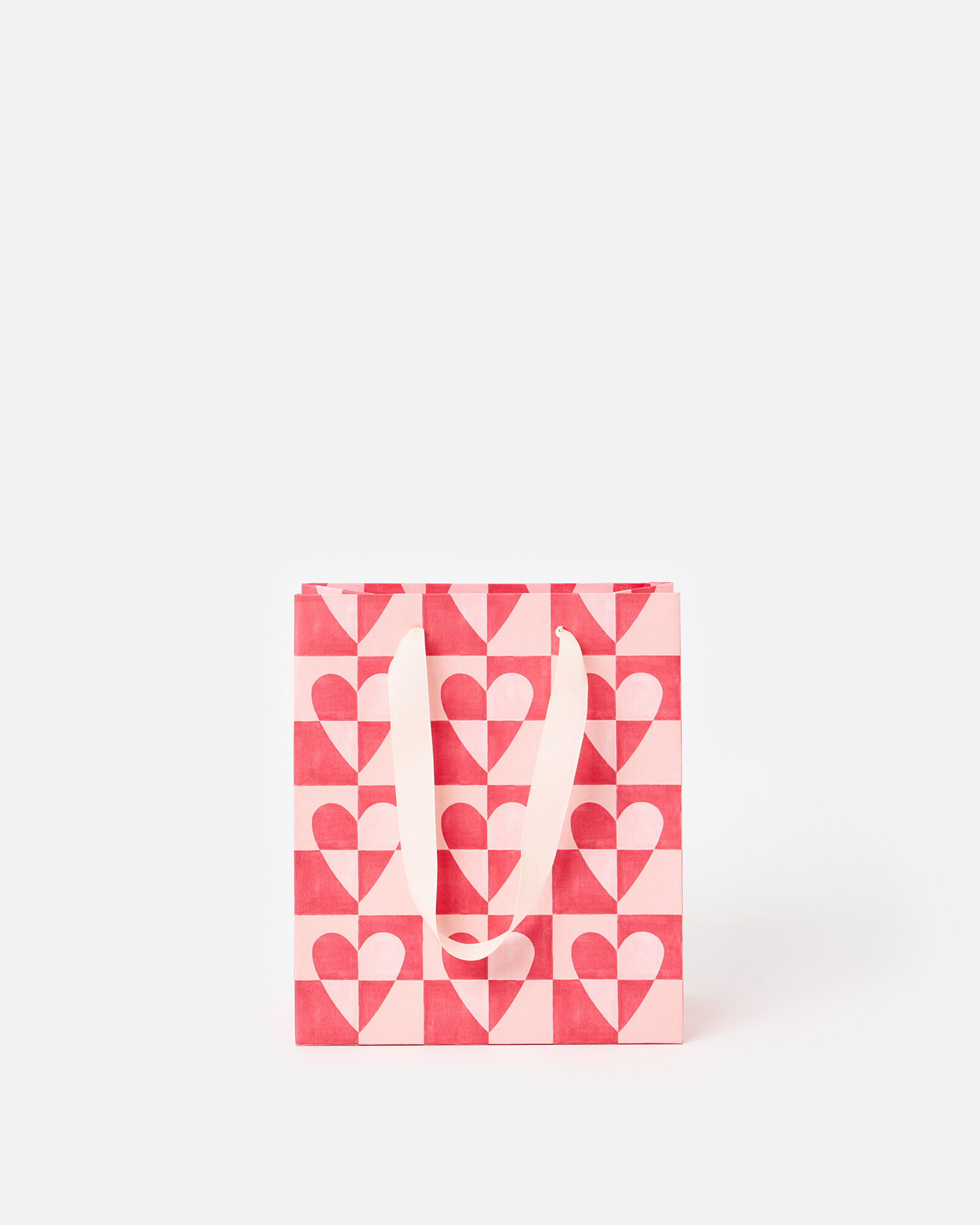 Medium-sized paper gift bag featuring a geometric heart tile pattern in block pink and red hues. Finished with white ribbon handles.