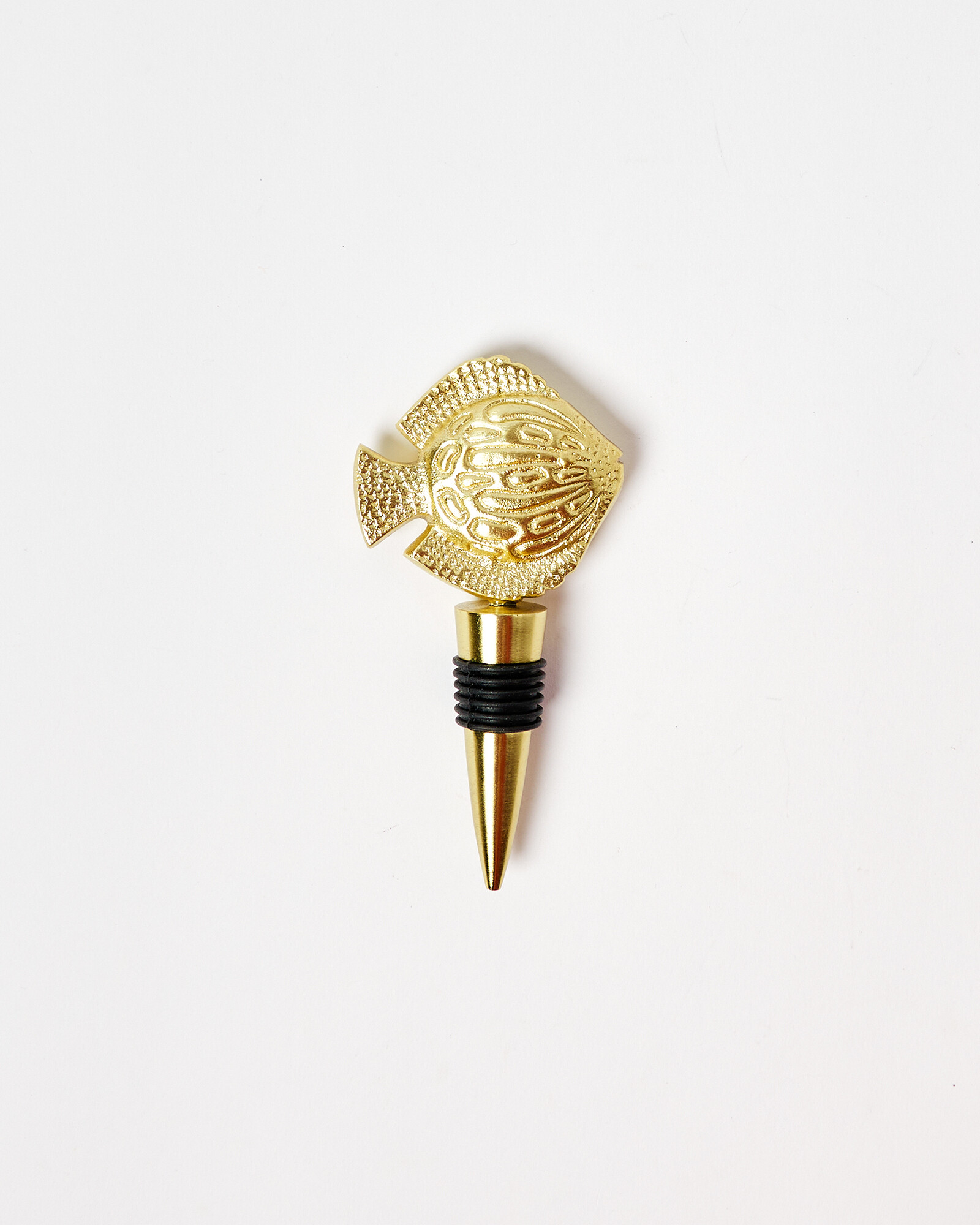 Golden bottle top with a rubber stopper and fish motif, detailed with intricate markings.