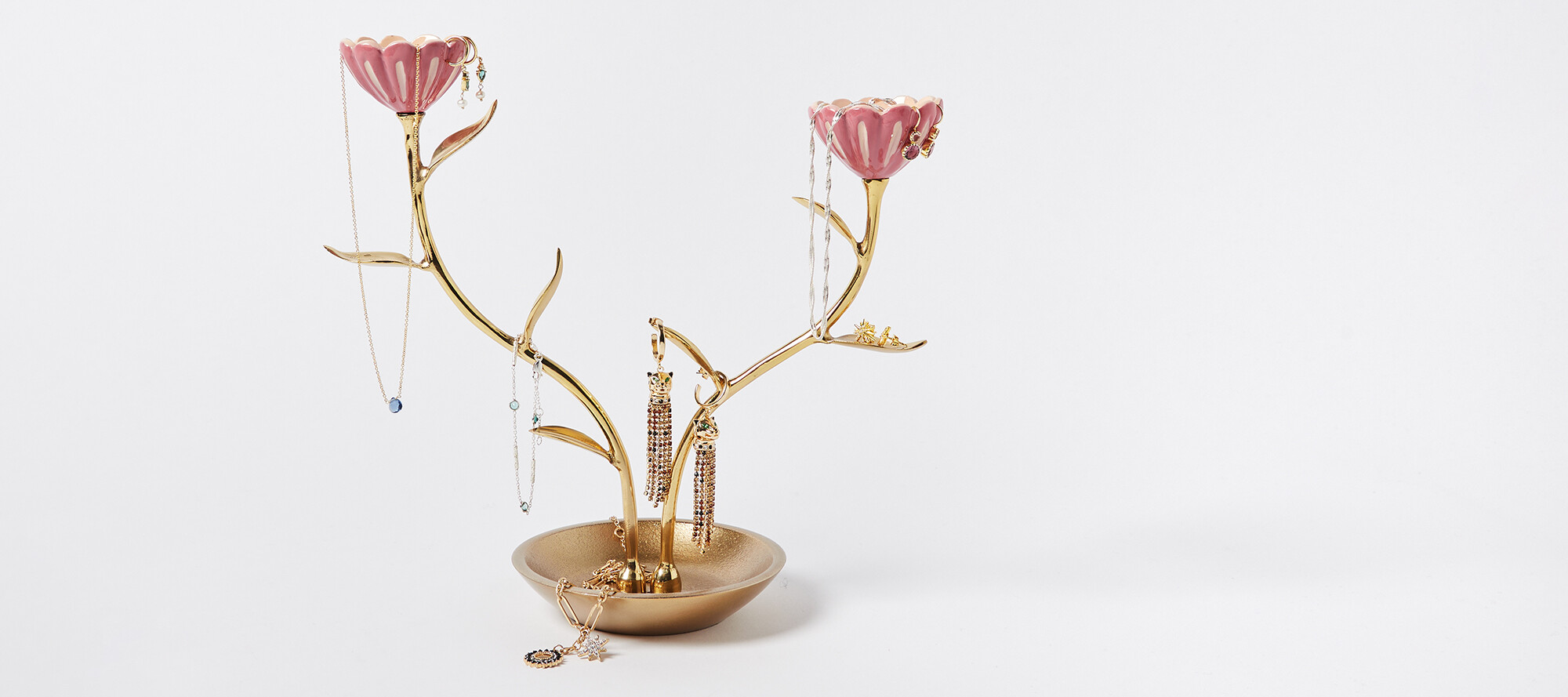 Jewellery stand or ornament, this handmade piece combines two golden stems with pink flowers that can hold small pieces of jewellery.