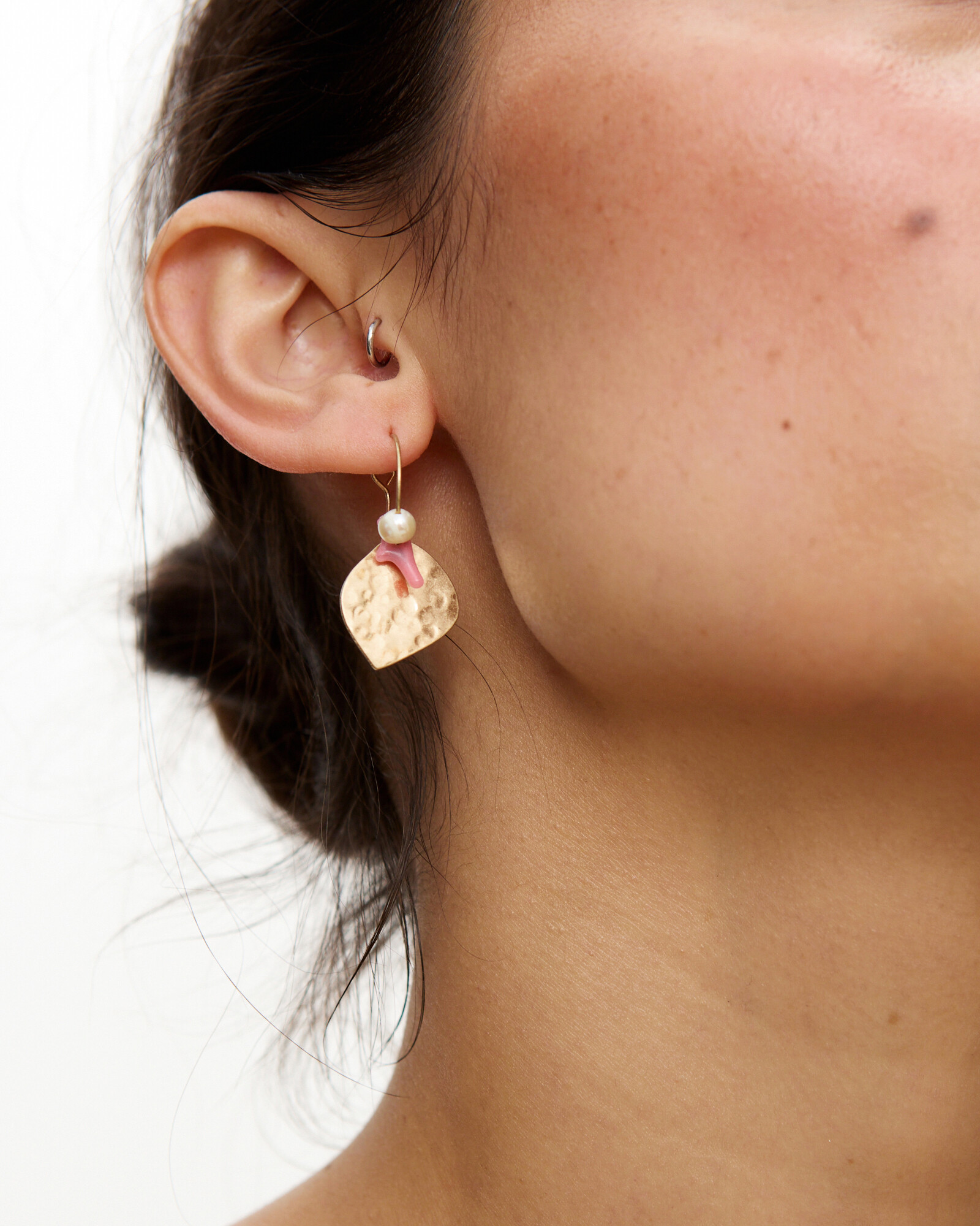 Gold toned wire hoop earrings featuring multiple charm drops, including a faux pearl bead, an abstract pink charm and a large, gold toned leaf with a hammered surface texture. Add texture and colour to your festival looks, pair with the matching Fern Layered Necklace, and combine with other colourful jewellery and accessories for summer-ready styling.